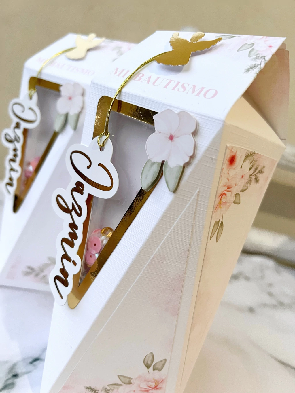 Caja Shaker realizada en papel tarjeta o papel telado (depende de la opción varía el precio) + tag con nombre dorado + sticker cierra caja